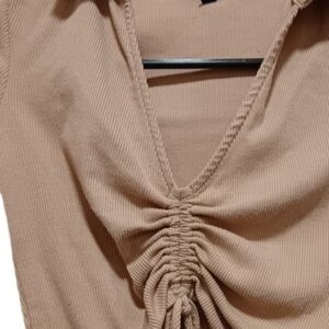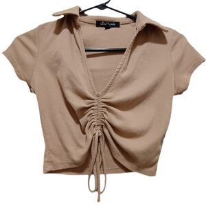 Upgrade your wardrobe with this stylish tan crop top featuring a chic ruched design. Ideal for casual outings.