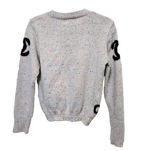 The Mixed Wool Yarn Cream with color flecks Long Sleeve Pullover Chanel Sweater in size M is a stylish and comfortable addition to any woman's wardrobe. Made with a cable-knit style and featuring a crew neck, this sweater is perfect for casual occasions. The ivory color and flower design add a touch of elegance, while the raglan sleeves provide a modern twist. Crafted with a mix of wool yarn, this Chanel sweater is a versatile piece that can be easily dressed up or down for any event. Note: this is NOT a Coco Chanel sweater.