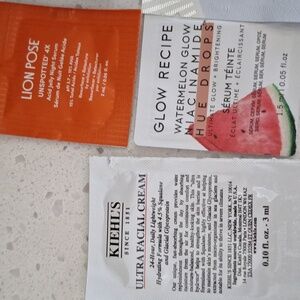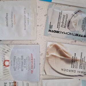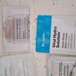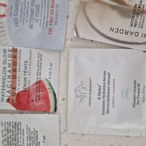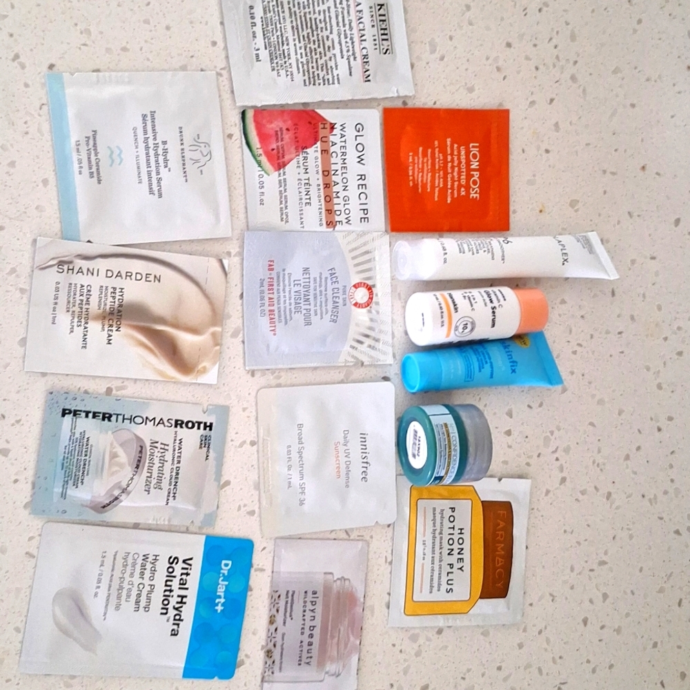 Samples of Drunk Elephant, First Aid beauty, innisfree, alpyn beauty, glow recipe, confidence in a gel cream, vital hydra solution, farmacy honey potion plus, lion pose unspotted, kiehls, glow recipe vitamin C, PTR water drench hyaluronic cloud cream, skinfix barrier triple peptide cream, olaplex No. 6, and Shani Darden hydration peptide cream.