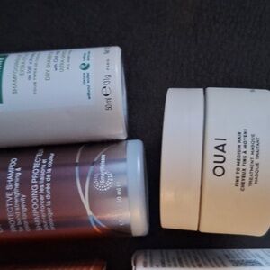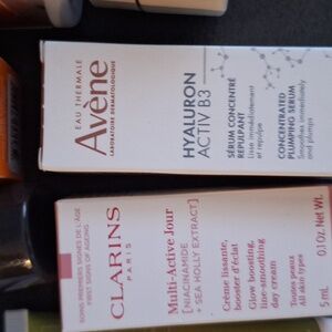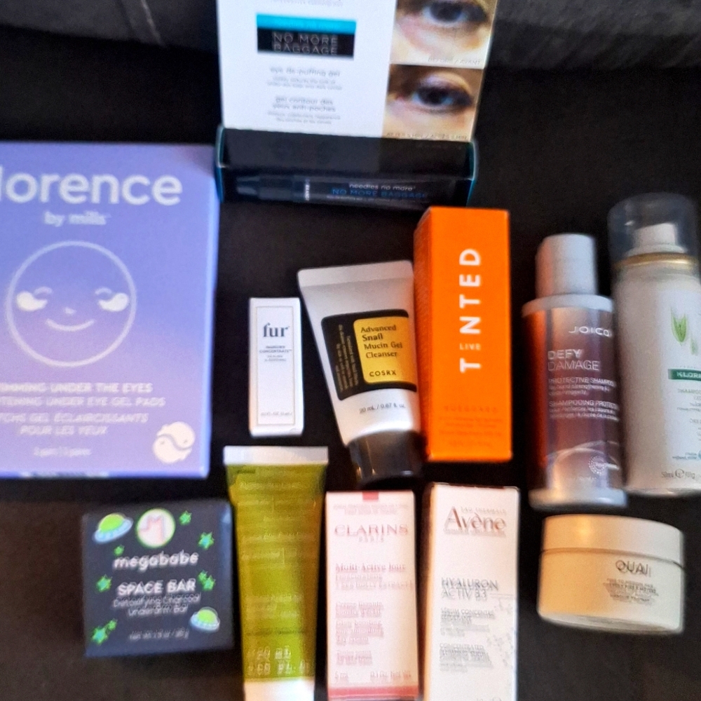 Florence by Mills swimming under the eyes brightening under eye gel pads, Dr. Brandt no more baggage eye de-puffing gel, megababe space bar, fur ingrown concentrate, advanced snail mucin gel cleanser, Live tinted huegaurd, Joico Defy damage protective shampoo, Kloraine dry shampoo with Oat milk Ouai hair mask, Clarins multi-active jour, Avene Hyaluron Activ B3, and Korres poreless skin cream.