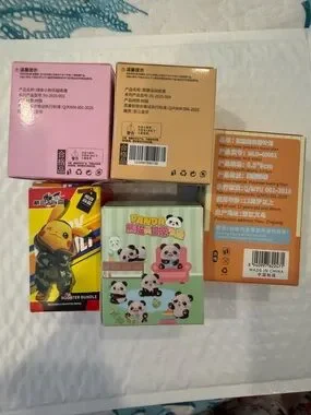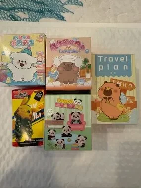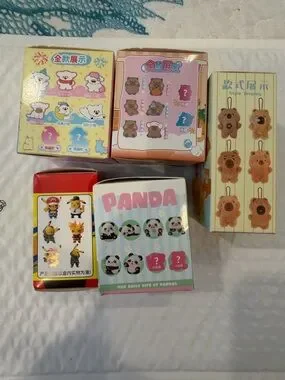 a collection of various anime and cartoon-themed blind boxes and stationery sets, featuring characters like Pikachu, capybaras, pandas, and other cartoon puppies.