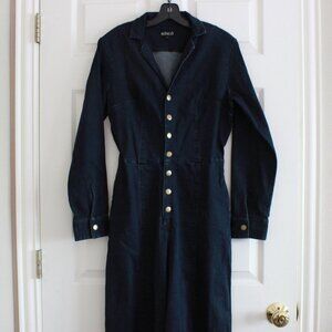 denim jumpsuit, long sleeve jumpsuit, dark wash denim jumpsuit, wide leg, v-neck, button up, 70s, flare, Parisian