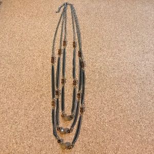Mixed material, layers add dimension to this necklace. 3-connected layers. Silver & black chain.