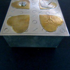 Cute little vintage box is in excellent condition with minor patina. It measures 2" x 2" x1". Lid flips up...does not lock. Perfect for pills, candies, or ??? Nice way to present a small gift...like jewelry!