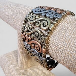 Pretty mixed metals in antiqued tones of gold, silver and copper - Cuff style stretch bracelet