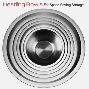 Useful Features: Save valuable space with these nesting bowls, cups, and spoons, which fit seamlessly together for easy, compact storage. Flat bases keep the metal bowls sturdy and rolled rims make it easier to pour ingredients.