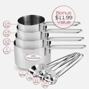 Measuring Spoons & Cups: Featuring accurate, laser-etched markings, this set includes four stainless steel measuring cups in ¼ cup, 1/3 cup, ½ cup, and 1 cup. The four metal measuring spoons include ¼ tsp, ½ tsp, 1 tsp, and 1 tbsp and are attached to a removable ring.
