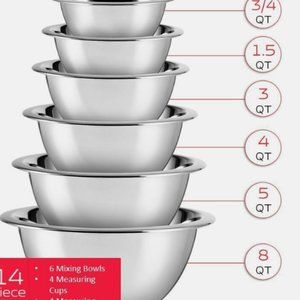 Lightweight Kitchen Bowls: Great for prepping ingredients in advance, this set of 6 stainless steel mixing bowls - ¾ qt, 1.5 qt, 3 qt, 4 qt, 5 qt and 8 qt - are refrigerator-safe, freezer-safe, and dishwasher-safe, to accommodate all your mixing, cooking, and baking needs.