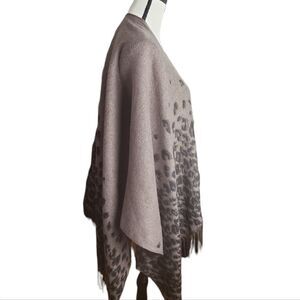Mixit cape poncho in a brown and black cheetah print with a fringed hem and open front. One size.
