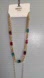 Chic gold necklace with vibrant purple and green beads. Perfect for adding color to your look.