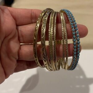 Chic gold and blue bracelets. Perfect for layering. Enhance any look effortlessly.
