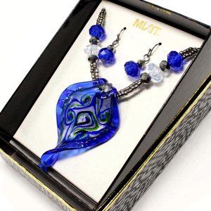 This gorgeous set by Mixit is made of cobalt blue Murano glass, gunmetal gray, beads, hematite, and blue cut glass crystals.. The necklace is 17" long plus it has a 3" extension. the twisted glass pendant is 2 3/4""x 2"; the earrings are 1 1/4" long. Everything is in the original gift box and in perfect condition.