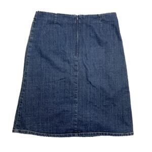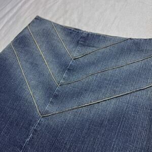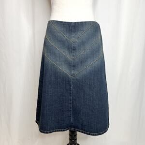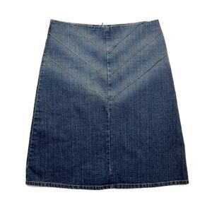 Mid length A-Line jean skirt with triangular chevron stripe paneling. Ombre fading to a lighter wash near triangle. Zipper closure. Vintage Y2K.