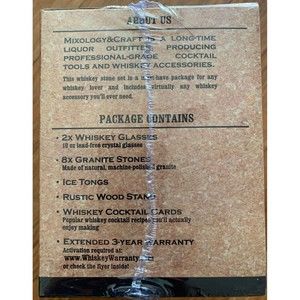 FREQUENTLY ASKED SHOULD I WASH THE GLASSES AND STONES BEFORE THE FIRST USE! YES. - Just like any other kitchen utensils, make sure to wash your whiskey tools before using. WHERE CAN I FIND WHISKEY COCKTAIL RECIPES? Inside this box you can find a deck of cocktail cards with a wealth of recipes and other whiskey info. HOW DO I USE THESE TOOLS? 1. Wash the wiskey stones thoroughly 2. Place the stones in the wood tray 3. Place the tray in the freezer 4. Chill the stones for at least 4 hours 5. Add 2-4 stones per serving of whiskey 6. Enjoy your cold (and undiluted!) drink PACKAGE CONTAINS 2X WHISKEY GLASSES 10 oz lead-free crystal glasses 8X GRANITE STONES Made of natural, machine-polishei granite ICE TONGS RUSTIC WOOD STAND WHISKEY COCKTAiL CARDS Popular whiskey cocktail recipes you'll actually enjoy making