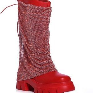 The Miz Big Red: Blinging Construction Boot is made from a faux leather upper and features a mid-calf shaft, a glimmering rhinestone mesh covered shaft, a lace up detail at the back, and a chunky textured flatform sole. Complete with a rounded toe and slip on fit.