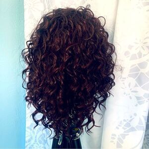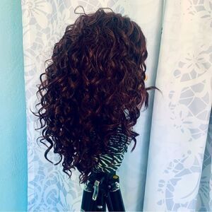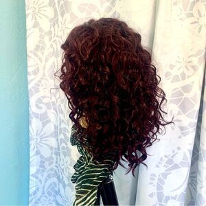 Pretty curly mid length synthetic wig. Color is a burgundy red/plum with black throughout. Center lace part. Wefted cap with combs & adjustable bra straps. Heat friendly up to 360. Approx length from the crown is 21” Only worn once. In great condition. Miz Collection Size Average.