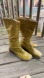 Really comfortable green Miz Moos! The color is a vibrant yellow-green. Like a light avocado. I can’t guarantee my photos are 100% accurate for color. I tried my best using daylight. I’ve had these for about 10 years and wore them seasonally. There is some wear but they are overall in very good condition! Perfect fall boots. They fit snugly on the calf but the sewn-in triangle of elastic at the top gives some leeway. Laying flat the top of the boot measures 7”