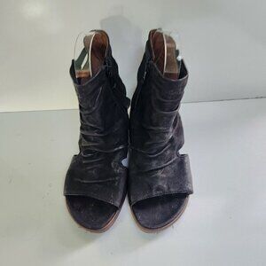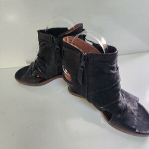 Miz Mooz New York Black Leather Open Toe Ankle Wedge Shoe Size 37(6.5). Open Toe, Open Heel, Cut Out Sides, Crinkle Black Leather Upper, Inside Zip Closure. Good Pre-Owned Condition