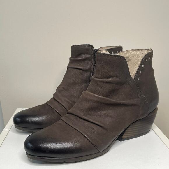 Miz Mooz Ruched Slouchy Leather Studded Ankle Boots Booties Zipper Brown Sz 38