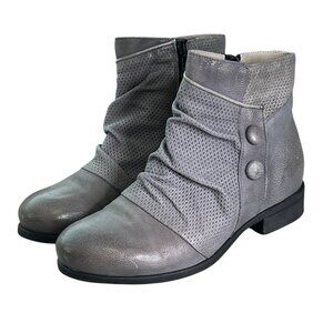 grey ankle boots, leather boots, miz mooz boots, casual boots, side zip boots, button detail boots, stylish boots, comfortable boots, fall boots, low heel boots, designer boots, women's wide fit boots, perforated fabric boots