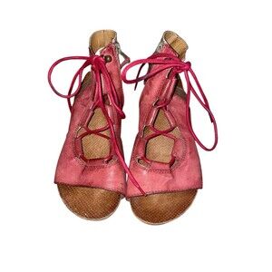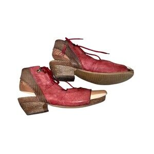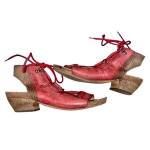Red leather sandals are stylish and comfortable heels perfect for various occasions like travel, parties, or casual outings. With an open toe design and lace-up closure, these beige sandals feature a wedge heel for added height. Made from high-quality leather, these sandals also have a zipper accent and a mid heel height for all-day comfort. Perfect for a bohemian-inspired look, these sandals by Miz Mooz are a must-have addition to any woman's shoe collection.