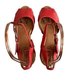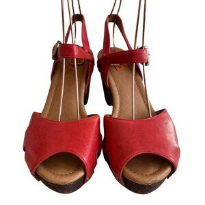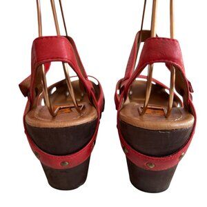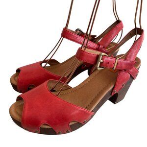 Miz Mooz Heather clog sandals, red leather, wrap around ankle strap, studded, wooden platform, 3.25" high heel, size 8.5, preowned and shows wear on the soles, scuffs/scratches - see photos