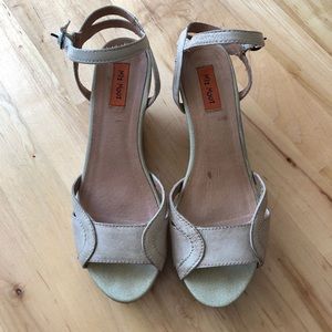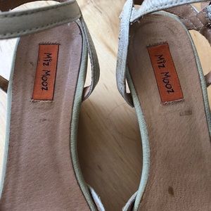 These are beautiful and comfy wedges!!! Miz mooz is a great brand - all their shoes are cute and good quality. Stripe design on wedge adds fun detail. Straps around ankle make shoe easy to walk in. Worn a handful of times w slight scuffing, but hardly noticeable. Great for a work or party shoe. Platform height approx 1 1/4”, wedge height approx. 3”. Make an offer!!!