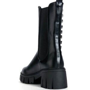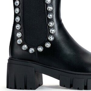 With a mid-calf height shaft and round toe silhouette, the Miz Rhinestone Flat Platform Chelsea Boot is a must-have for every fashionista's shoe collection. It's crafted with a vegan leather upper that ensures a comfortable fit, while the flat platform sole provides a balanced and stable feel.