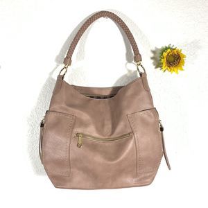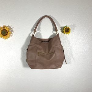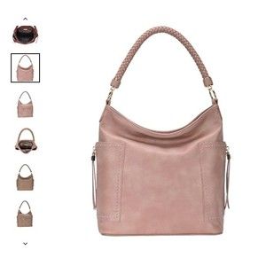 Miztigue Vegan Leather Handbag Shoulder Bag Grace Hobo Mauve Lilac Purse. The purse is in pretty good condition. Product information from website: The Grace hobo is renowned for its classic Miztique vegan leather construction. Subtle light gold hardware provides a delicate finish, while a structured base and rope braid handle guarantee versatile practicality. An effortless addition to any ensemble, the Grace hobo is a timeless companion for any journey. Braided top handles Vegan leather Minimalistic pattern print inner lining Metal zip closure Side zipper detail Internal slip and zip pockets Bag: 15"L x 5.5"W x 12.75"H Top Handle: 8" Outer Shell: Vegan Leather (100% Polyurethane) Lining: 100% Polyester