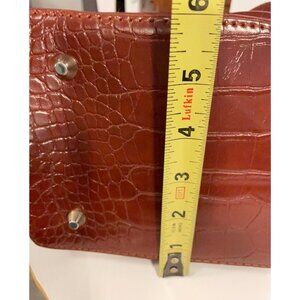 This vintage Unisex Miztique shoulder crossbody bag is a stylish addition to any outfit. The exterior is made of polyurethane with a crocodile embossed pattern in oxblood/ brown. The bag features a zipper around the bag for easy access and a brown polyurethane handle/strap. The hardware is silver in color and the lining is brown fabric.