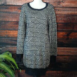 Mizumi Sweater Dress M Fuzzy Soft Eyelash Knit Black Cream Geometric Tunic