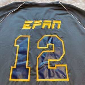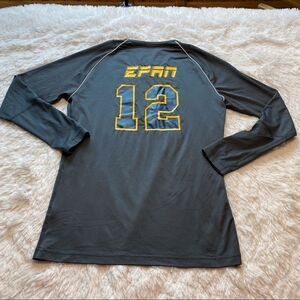 Mizuno Long Sleeve V-Neck Gray Shirt with Number 12 Size Large. Excellent used condition. Reflective trim. Front has “12”, back EPAN “12”. Measures chest 38”, length 28.5”, sleeve 25”.