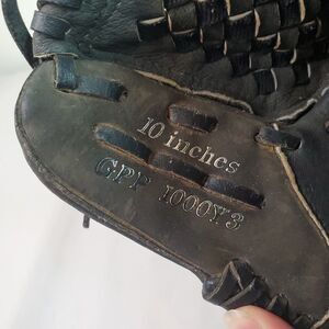 Condition: Well worn from use on baseball field. Shows discoloration and wear to that effect. Words faded or worn away printed on glove. Some paint or other marks or stains noted.