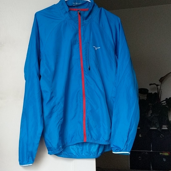 Lightweight windproof Mizuno jacket. Small left breast pocket large enough to fit a phone (tested with a Pixel 2). Men's small but fits like a women's S/M