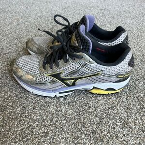 Mizuno WOMEN'S WAVE RIDER 15 Running Shoes, White/Silver/Yellow/Black Size 8