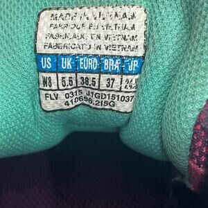 Pink and teal. Fabric and mesh. Inserts are in great condition. Cushioned tongue and collar. NOTE: some wear to fabric at inner collar near lacing and see last 2 pics). Otherwise in good preowned condition. Priced accordingly.