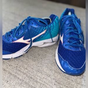 Stylish Mizuno running shoes. Vibrant blue with teal accents. Comfortable and sporty design.