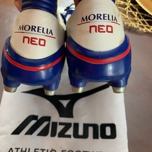 Mizuno Morelia neo white/pear and navy blue color Kangaroo leather foot ball boots make in Japan size 9 original price was $ 340 wear boots for only few games .
