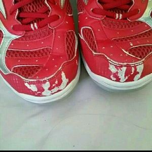 Red, white and silver shoes. Worn for one season during volleyball. The shoe is in good condition minus the wear of color on the tips of the shoes from diving! But has tons of life left I just don't play anymore, need them gone (:
