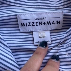 This is a Mizzen + Main Leeward button-up shirt in a classic fit. It features a blue and white pinstripe pattern. The fabric is a lightweight, stretchy blend designed to be wrinkle-free and comfortable. It has a hidden button placket and button cuffs.