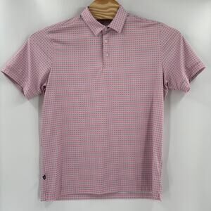 This is a pre owned Mizzen & Main Mens Medium Pink Blue Spotted Short Sleeve Polo Shirt. This item is in great condition with minimal or no signs of use.