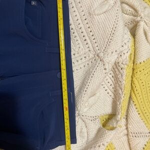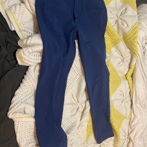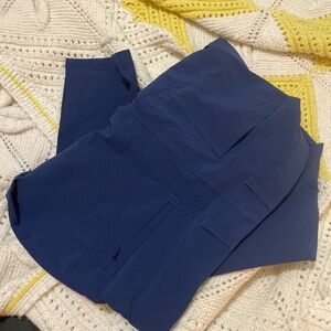 Mizzen and main men’s light, blue slacks, lightweight, a little stretchy, five pocket plus the back right pocket has a zipper. Great condition. Quite slim fit. Especially on the thigh and lower leg. I think they look excellent but they are just a bit tight for my muscular legs.