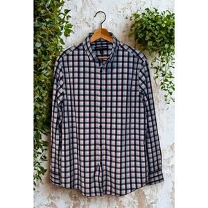 This version features the “No Tuck” length for a clean, modern look when worn untucked, and the Trim Fit for a sleek, tailored silhouette. The pattern combines light blue, navy, and pink gingham plaid, giving it a crisp, refined aesthetic.