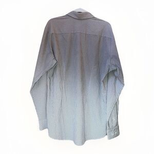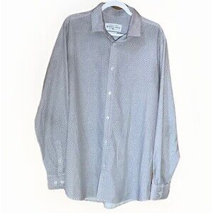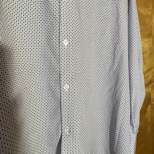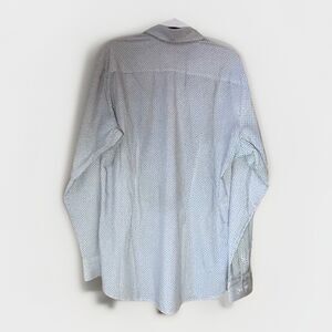 Features a subtle geometric microprint pattern in soft lilac and navy tones on white, button front, spread collar, and adjustable cuffs.
