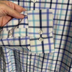 Mizzen+Main Leeward long sleeved performance shirt in size XL trim. White with black/purple/aqua square pattern, 82% polyester/18% spandex. Moisture wicking, wrinkle resistant, 4-way stretch, quick dry.