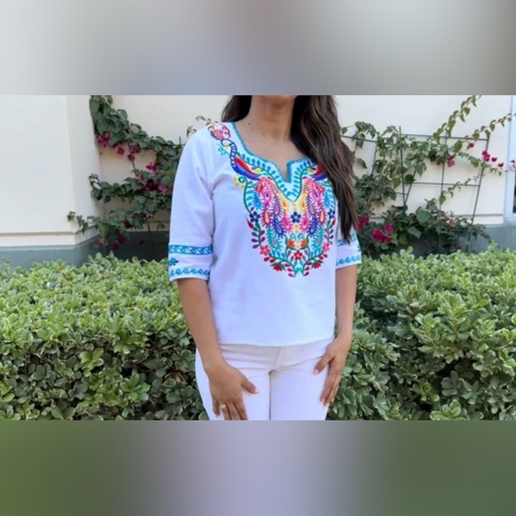 Mja world|White floral embroidered Mexican style peasant top•••Cotton, XL