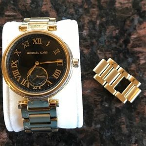 Chunky black and gold MK watch with bezeled “diamonds” around the face. This watch is versatile and works great dressed up or dressed down. Very good condition- extra links included