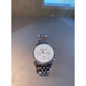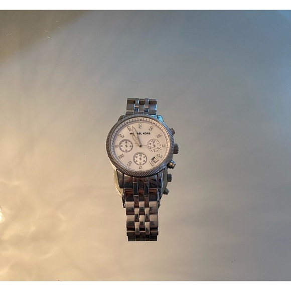 Michael Kors Silver watch. A few scratches on the chain link but in good condition. It’s 5 3/4in and stainless steel