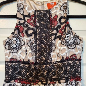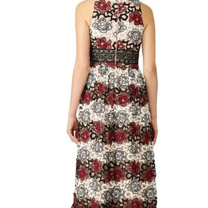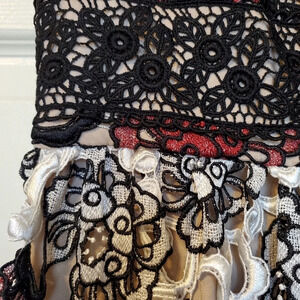 Gardenia lace gown in black, red and white floral lace with nude lining throughout. Hidden back zipper with hook and eye closure. Pit to pit is 13", length 58" and waist 12". Excellent used condition, no snags, holes or stains. Truly beautiful dress!
