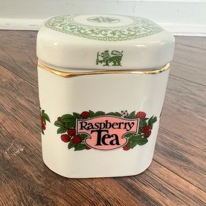 Mlesna Porcelain Raspberry Tea Jar. Cute porcelain tea jar with gold trim, no chips or cracks. Perfect for fans of raspberry tea or those who collect these lovely tea jars